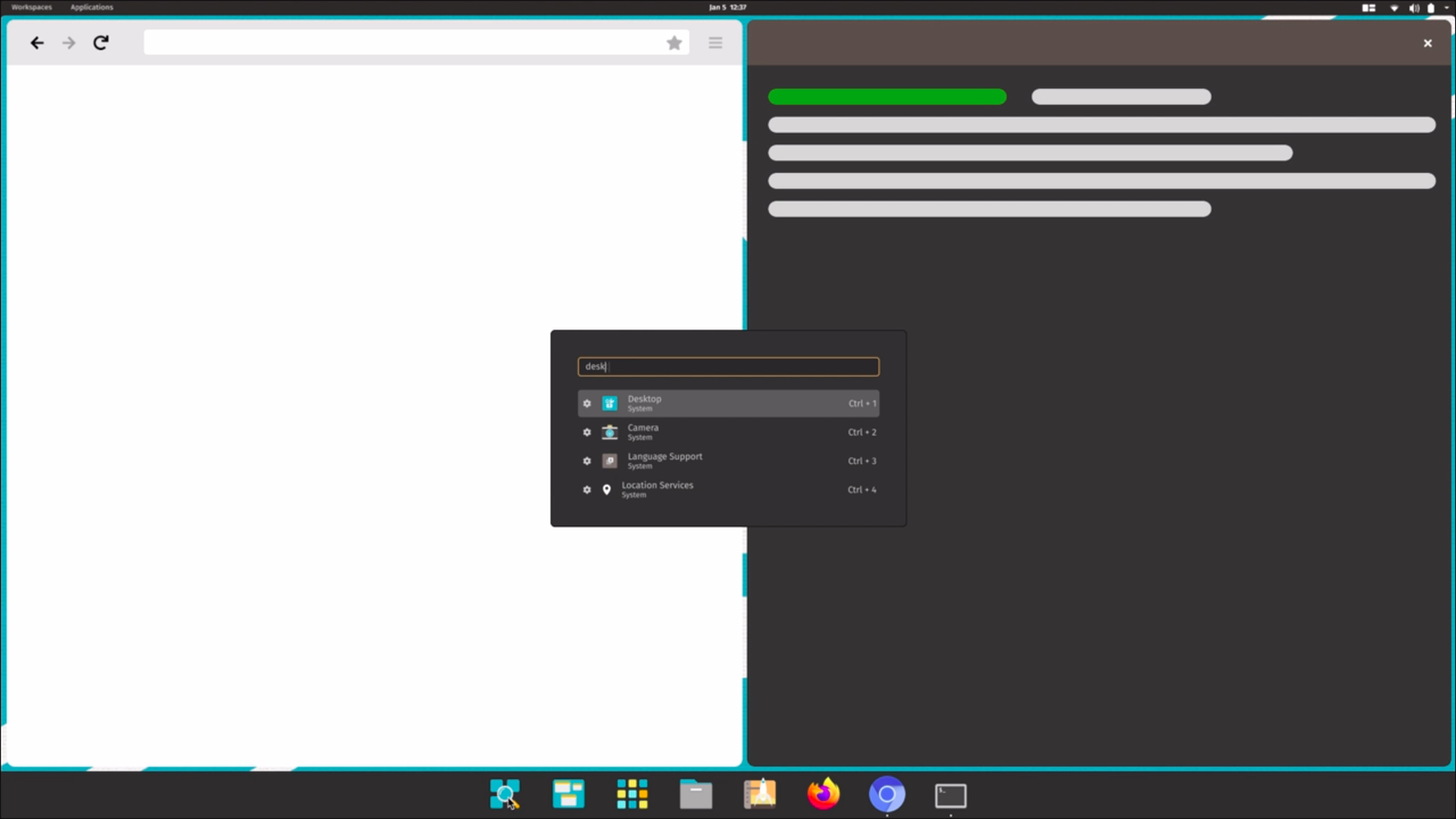 Um novo lançador também foi implementado (veja abaixo). Parece com outros lançadores disponíveis hoje, por exemplo, Krunner no KDE Plasma . O Launcher pode ser iniciado usando a tecla Super e também um ícone dedicado no dock. Você pode pesquisar aplicativos e iniciá-los facilmente.