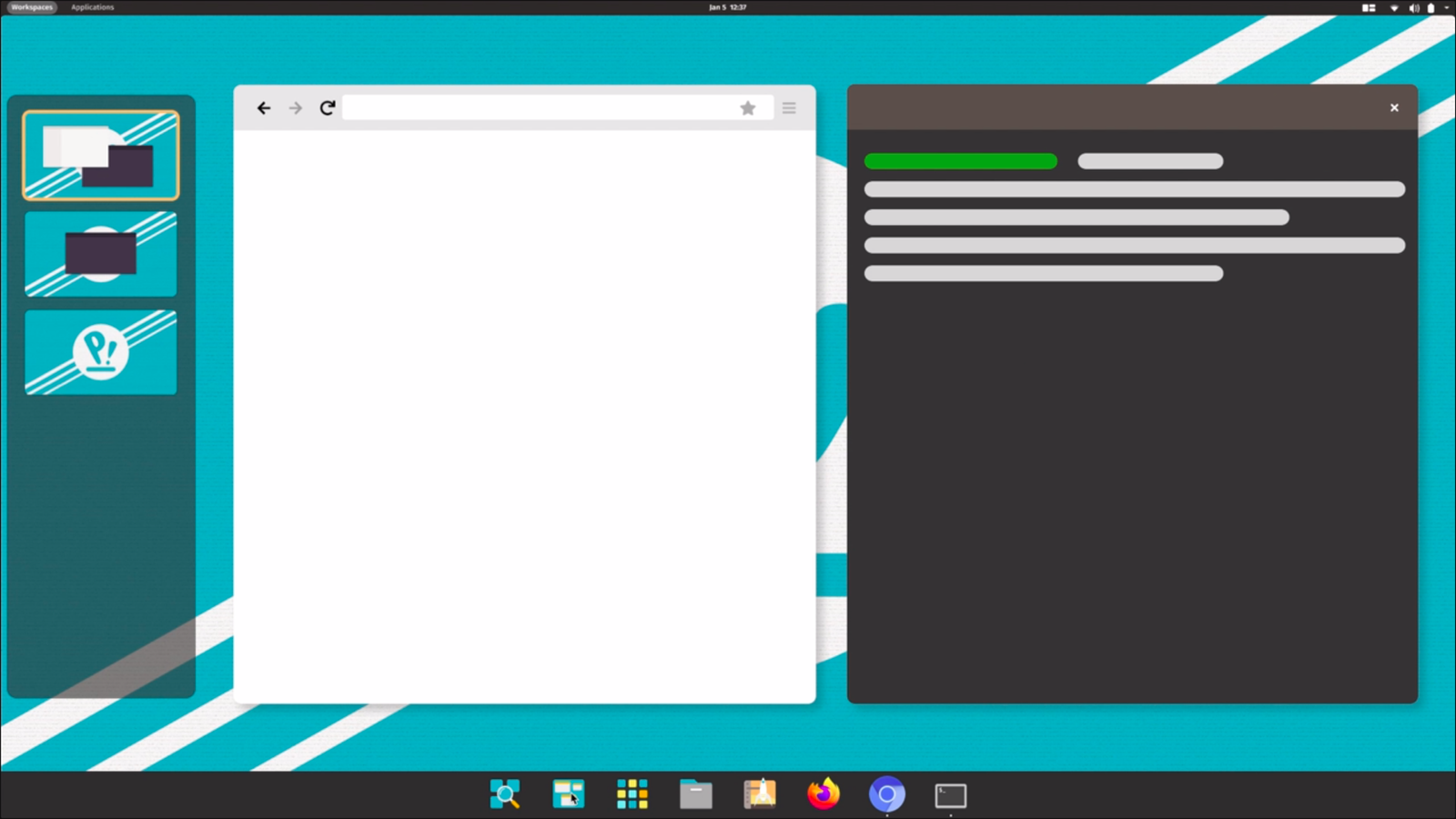 A visualização da área de trabalho também é diferente. Você obtém uma lista de áreas de trabalho no lado esquerdo com uma pequena visualização dos aplicativos em execução à direita. Este é um design completamente diferente do novo modo de exibição horizontal GNOME 40 de áreas de trabalho. E é ainda diferente da visualização do GNOME 3.38, que tinha a visualização da área de trabalho vertical no lado direito.